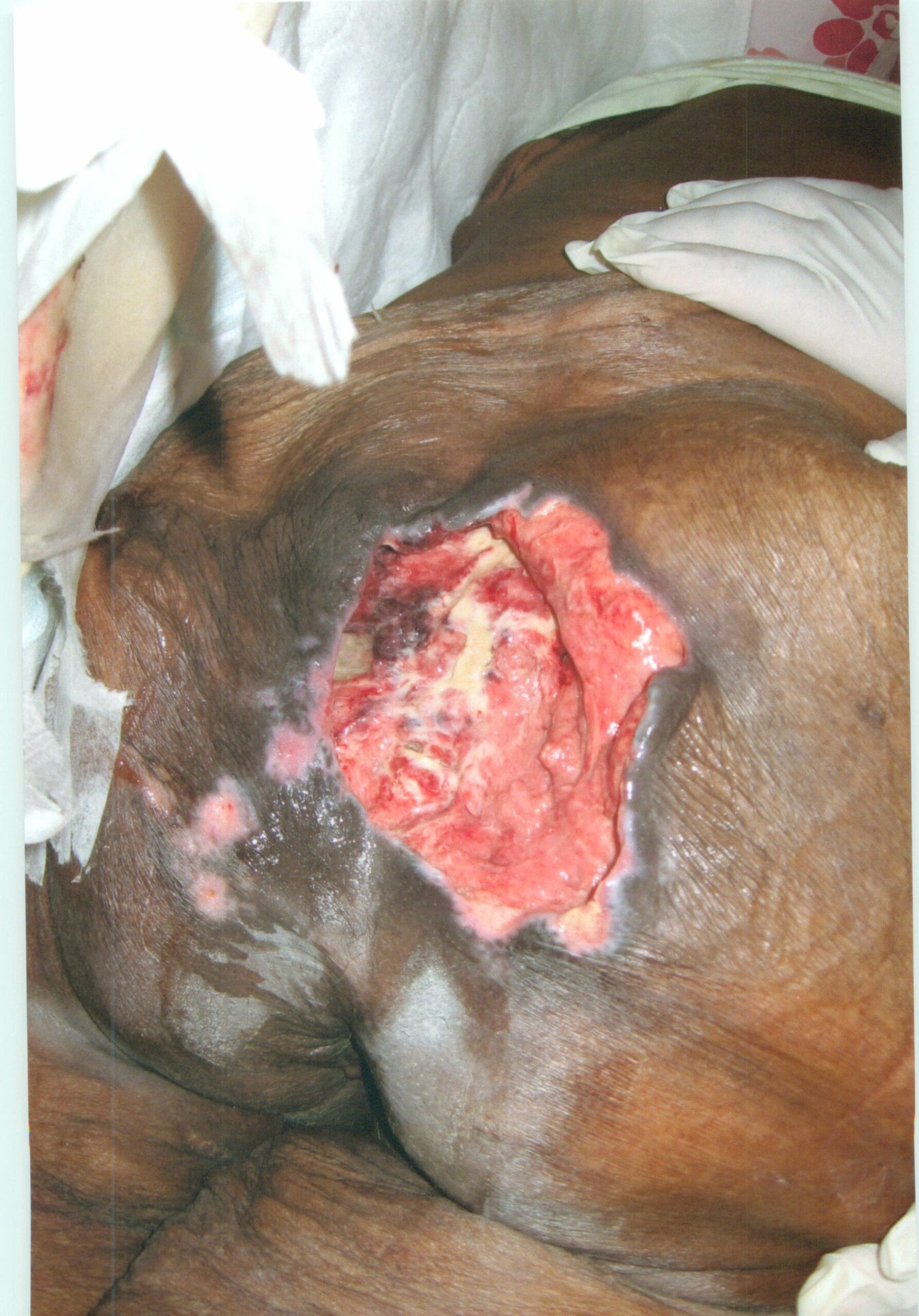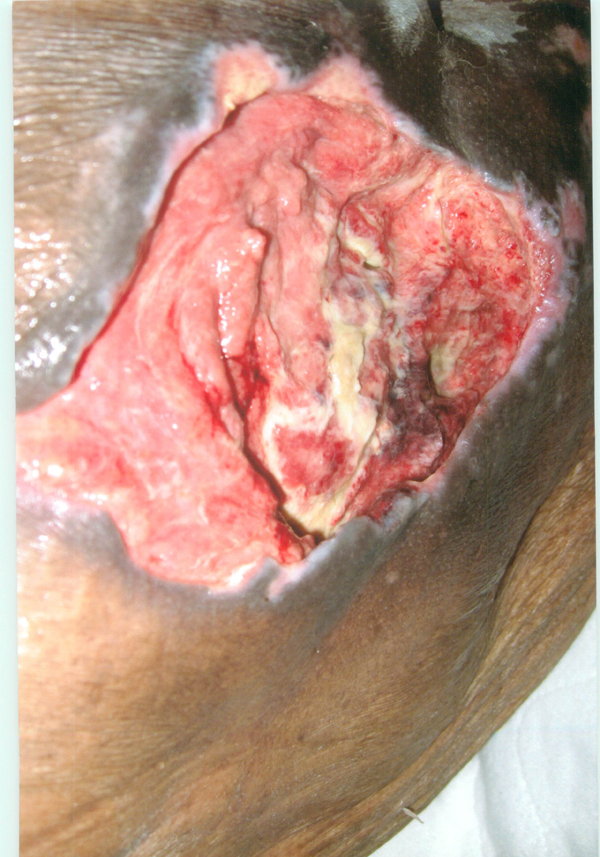 Within three weeks after the pressure ulcer (bed sore, bedsore, pressure sore, decubitus ulcer) was first observed, the wound was documented to have been “worsening, with more maceration seen on wound edges.” Several days later, the pressure ulcer was noted to have increased in size from 4.0 cm x 2.5 cm to 5.0 cm x 3.5 cm and 50% of the wound bed was documented to have been comprised of necrotic tissue.