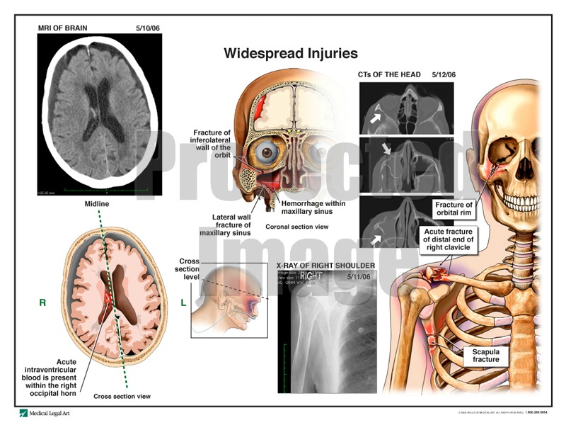 As a result of the fall, the patient sustained impact to her face and head, lacerations to the face and right hand, bruising to the right side of her face, a right orbital fracture that included fractures to the orbital rim, floor, anterior and lateral walls of the right maxillary sinus, and the inferior wall of the right orbit, significant bruising around her right shoulder, a right clavicle fracture, and a right scapula fracture. She also developed an intraventricular bleed and a traumatic brain injury as a result of the fall. As a result of her orthopedic injuries, the patient was permitted to bear weight on her right shoulder only as tolerated and was placed in an arm sling. She also experienced pain and increased confusion as a result of her injuries. The patient died for reasons unrelated to the fall approximately nine months later.