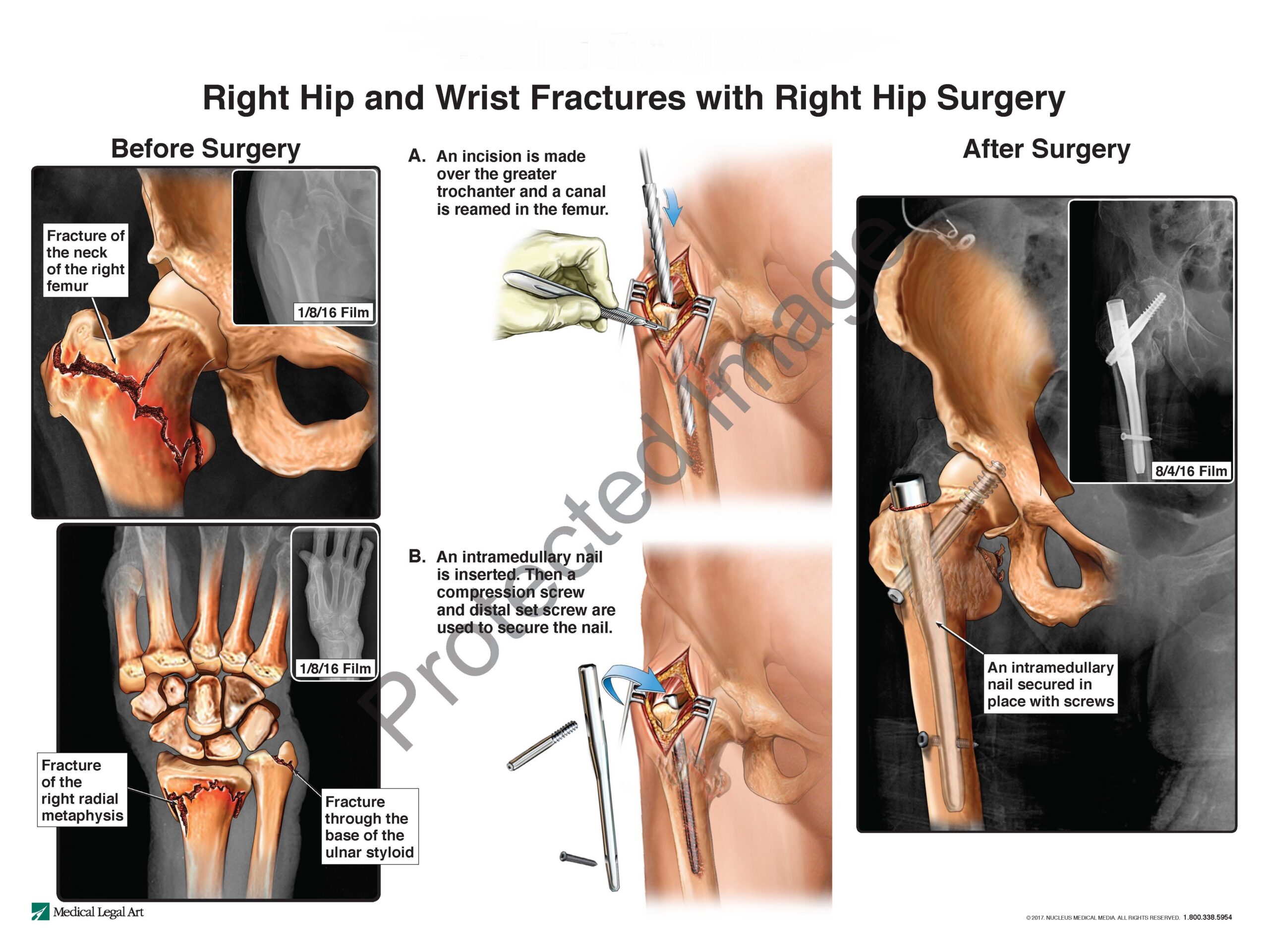 The patient was taken to the hospital, where she was diagnosed with a right hip fracture, an impacted fracture of the right distal radius, and a fracture of the right ulnar styloid. She received intramedullary fixation surgery on 1/9/16 for the right hip fracture. Fractures of the patient’s right wrist were treated conservatively with a sugar tong splint. The patient was right-hand dominant. She remained a patient at the hospital until 1/12/16, when she was returned to the assisted living facility.