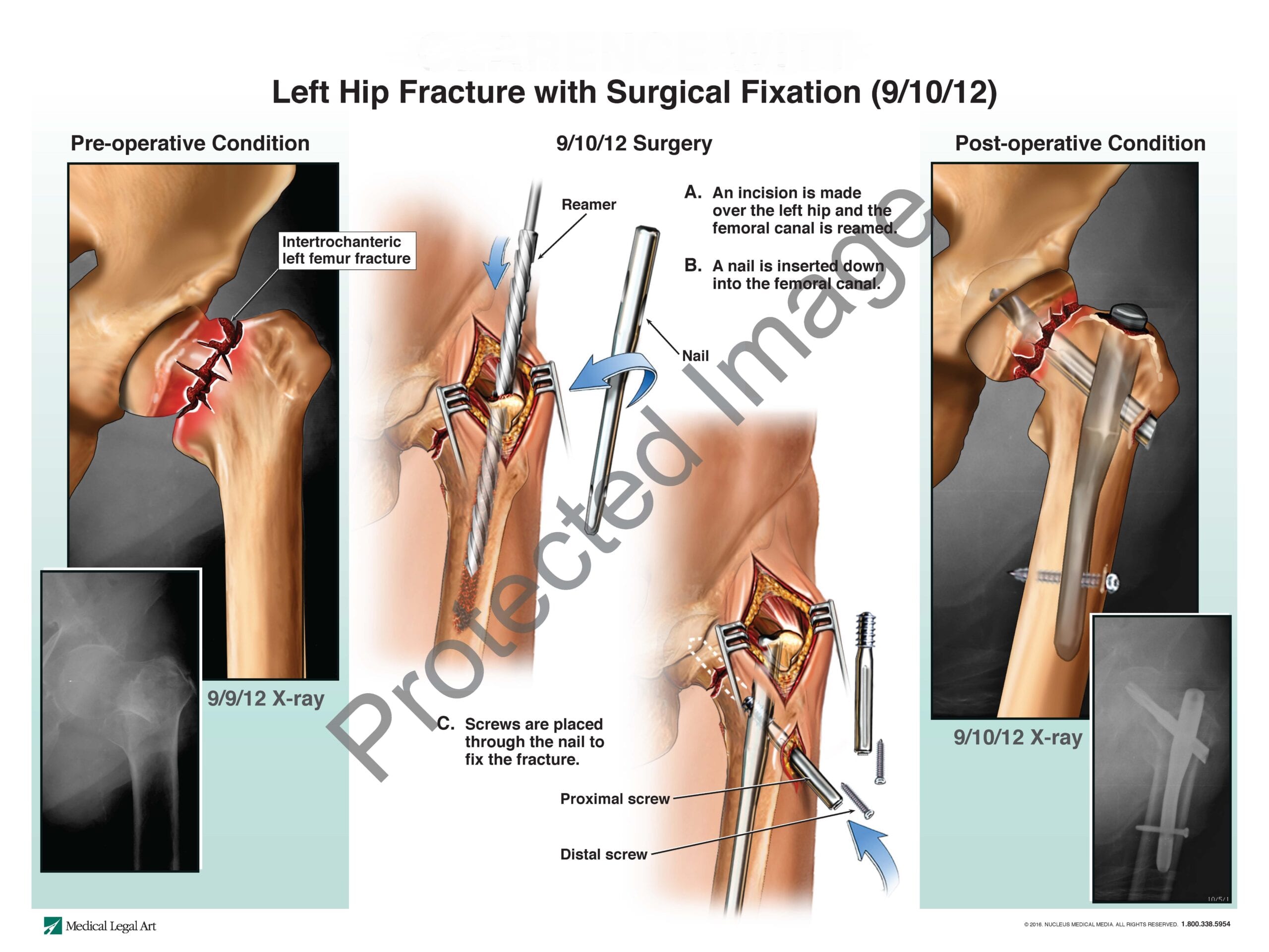 In the early morning of September 8, 2012, the nursing home permitted the patient to fall. The patient was found on his back on the floor in front of his bathroom and was assisted by the nursing home’s staff back to bed. As a result of that fall, the patient complained of left hip pain and was noted to clutch his left hip and grimace. An x-ray confirmed the patient sustained a left intertrochanteric hip fracture as a result of the fall, and he was transported to the hospital, where he required open reduction internal fixation surgery. The patient died on November 15, 2013.