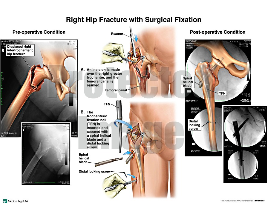 As a result of the August 6, 2005 fall, the patient sustained a displaced right femoral neck (i.e. right hip) fracture. She was admitted on an emergency basis to a local hospital, where she underwent a bipolar prosthetic arthroplasty the day after the fall. She remained at the hospital through August 11, 2005, at which time she was transferred back to the nursing home for rehabilitation. She suffered significant pain and immobility as a result of the right hip fracture.