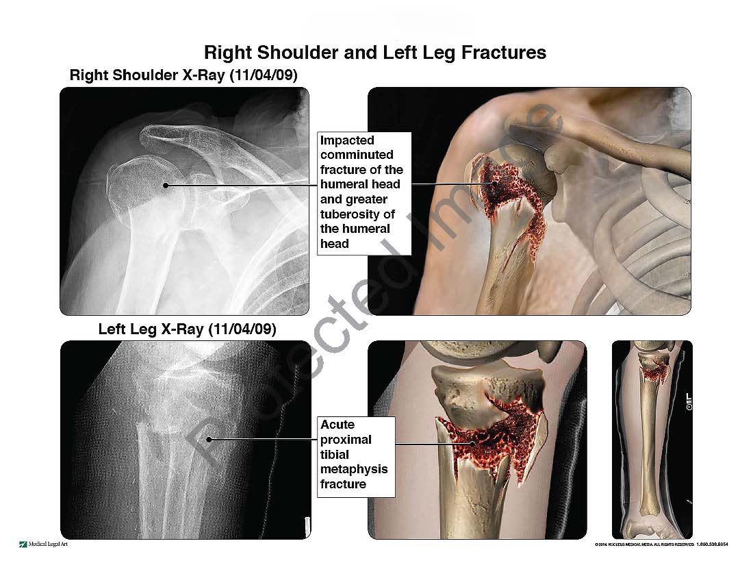 The patient complained of pain from the fall and advised a CNA she needed to be taken to the emergency room. When the ambulance arrived, the patient was yelling in pain. Her left leg and right shoulder were obviously deformed with swelling and bruising. On examination at the hospital, x-rays revealed fractures of the left proximal tibia and right humeral neck. The patient was placed in a sling for the right arm fracture and a long cast for the left leg fracture. The patient was not a surgical candidate due to her age and activity level, and the orthopedist advised the patient’s family that she would have a prolonged period of immobility.     On November 9, 2009, the patient was readmitted to the care of the nursing home and its physician. As a result of the fracture and the patient’s ongoing C.diff diarrhea, she was dependent on staff for all ADLs. The patient’s orthopedist shortly thereafter noted that her leg cast was “soaked with urine.” The cast was removed and replaced with a new cast. The patient’s orthopedist ordered gentle range of motion therapy. On November 21, 2009, the patient was finally tested for and diagnosed with C.diff. The nursing home facility and treating physician did not timely or properly treat the patient for C.diff, and the patient continued to receive Imodium.